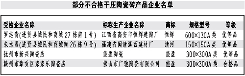 本報(bào)訊記者龔漢斌報(bào)道:近日,江西省質(zhì)監(jiān)局公布了近期對(duì)干壓陶瓷磚產(chǎn)品進(jìn)行省級(jí)產(chǎn)品質(zhì)量監(jiān)督抽查的結(jié)果。質(zhì)監(jiān)部門(mén)共抽查了51家生產(chǎn)企業(yè)生產(chǎn)的52批次產(chǎn)品,抽樣合格率90.4%。抽查結(jié)果表明,本次抽查的陶瓷磚其放射性核素限量指標(biāo)均達(dá)到了標(biāo)準(zhǔn)規(guī)定的要求;但仍有部分產(chǎn)品存在一些問(wèn)題。